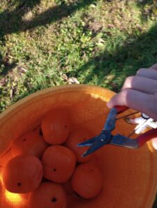 収穫中は肩からカゴをさげて、次々と柿の実を入れていきます。