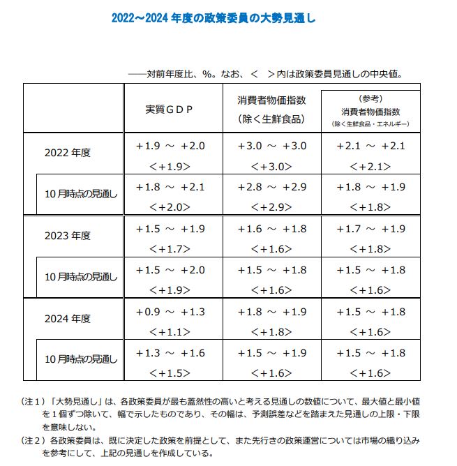 昨年、日銀が発表した3年間のGDPと消費者物価の見通しです。